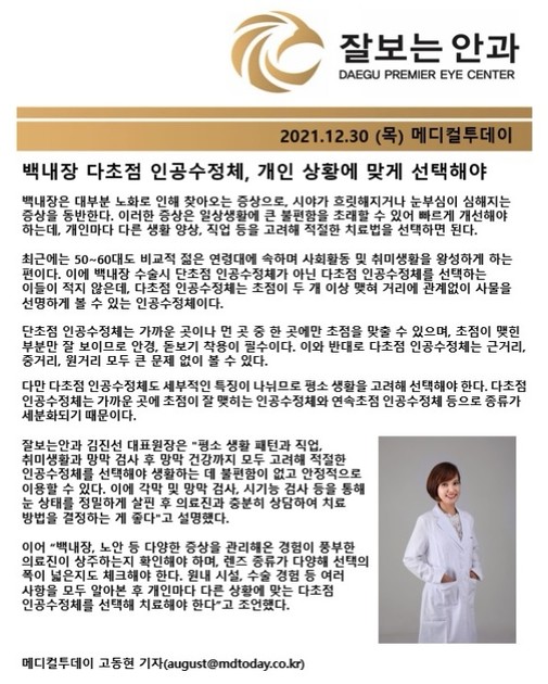 특히, 현재 조사되고 있는 대구 백내장은 노안과 공존하는 대표적인 노인성 질환으로, 나이가 들면서 누구에게나, 대부분의 사람들에게 발생할 수 있습니다. 필요하지도 않습니다. 오늘은 대구연세안과에서 알아보도록 하겠습니다. 식별 가능한 증상이 있습니까?