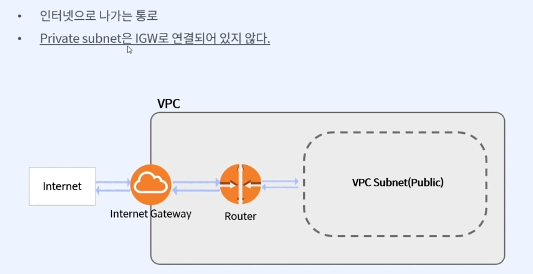 IGW: 인터넷과 VPC 내부 구성 요소와 통신하는 매체입니다.