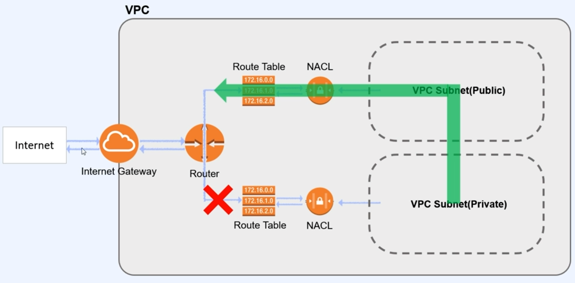 프라이빗 서브넷은 외부 인터넷과 통신하지 않는 서브넷이므로 IGW에 연결되지 않습니다.