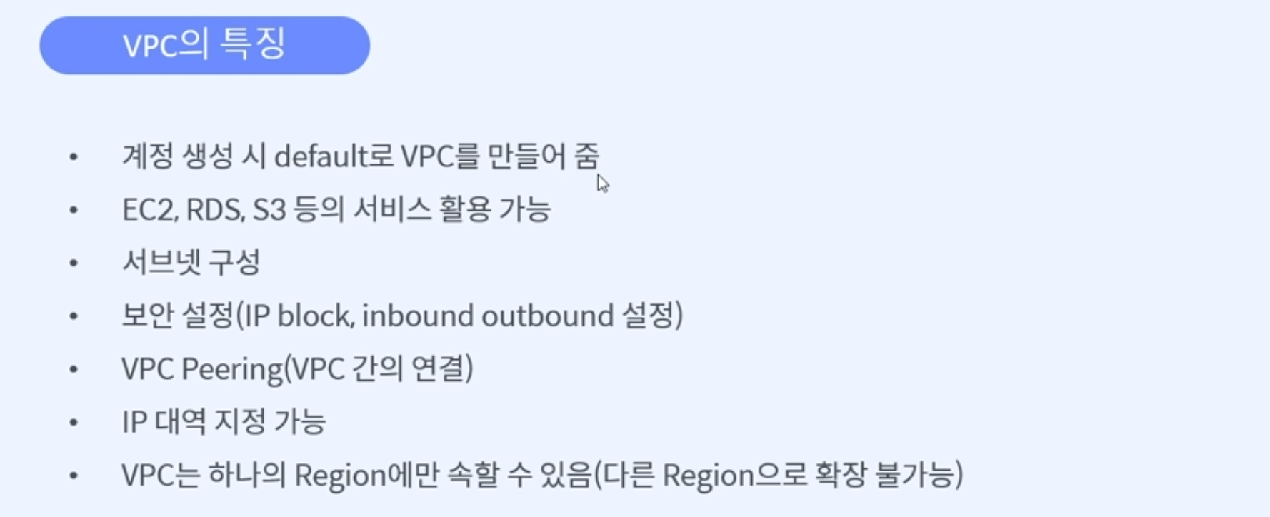 – VPC는 한 지역에만 존재할 수 있으며 다른 지역으로 확장할 수 없습니다.